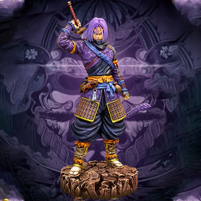 Die Figur zeigt Trunks im Samurai-Stil, mit traditioneller japanischer Kleidung und einer Metallrüstung. Er steht mit leicht gespreizten Beinen und hält sein Schwert in beiden Händen, das er gerade hinter sich erhebt, bereit, es im Kampf einzusetzen.